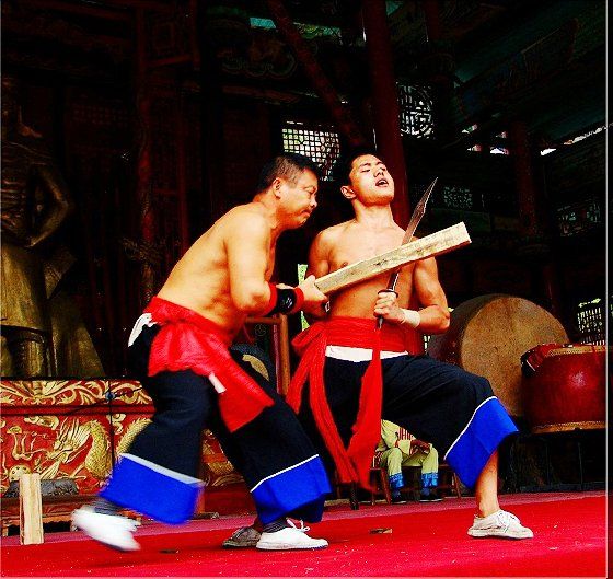 大庸氣功 大庸氣,堪稱武林奇葩,曾為祖國贏得聲譽,海內(nèi)外享有極主名望。 大庸氣功是大庸各民族特別是土家族傳統(tǒng)體育項 目之了,分健體氣派、武術(shù)氣功兩類。前者有“返還 功”、“馬王推氣功”、“少林達摩醫(yī)療保健氣功” 等;后者有靜坐、壁虎、靈子、二指彈、碎石、松靜 、硬氣、五禽、五陽功等,尤以硬氣功著稱。大庸硬 氣功,歷史悠久,漢代相單程,明代覃后,清代劉明 燈,當(dāng)代湯子模、周鐵鞭、杜心武、趙繼書等都具有 超人硬氣武功。大庸土著民族在漫長的反征服、反壓 迫斗爭,博采武當(dāng)、少林南北派、昆侖派眾家武林精 華,創(chuàng)造出獨此一家的大庸硬氣功。 據(jù)傳,大庸硬氣功鼻祖是楚國鬼谷子?!?a class="insidelink" href="http://www.mtcphone.com/cityinfo/15580531721.html" title="永定區(qū)">永定縣 志》有關(guān)鬼谷子隱居天門山鬼谷洞潛心學(xué)《易》、傳 授方術(shù)的記載。到清代有武林高手朱茂嶺,隱居三岔 村北芭蕉灣洞,研究鬼谷氣功之術(shù),后收西溪坪胡口 子、余世萬(即“余通人”)為徙,傳其衣缽。余通 人將武術(shù)氣功系統(tǒng)整理,發(fā)揚光大,播名于世。 新中國成立后,黨和政府十分重視民間氣功發(fā)掘 整理,并正式列為體育項目加以普及發(fā)展,今日大庸 市習(xí)練硬氣功達數(shù)萬人眾。永定區(qū)官黎坪村世有“硬 氣功之鄉(xiāng)”盛譽,該村男女老幼,練功已蔚成風(fēng)氣, 其武師趙繼書,1979年先后參加全省和全國武術(shù)大賽 ,均獲一等獎,受到國家體委重視,同年7 月趙繼書 專程到北京給中央領(lǐng)導(dǎo)同志匯報表演。嗣后,隨同中 國武術(shù)代表團和國家領(lǐng)導(dǎo)人先后兩次出國,到盧森堡 、意大利、比利時、羅馬尼亞、馬其他和東南亞等國 家訪問。他表演的臥刀碎石、頭頂開石、雙鳳灌耳、 頭碰石柱、叉尖推磨等精彩節(jié)目,博得外國友人好評 。盧森堡一位榮獲國家獎牌的武士,看了表演后連夜 來到中國大使館,將自己珍藏多年的獎牌贈送給他; 盧森堡國王主動熱情走上臺與趙繼書熱情擁抱,連連 稱贊:“了不起!了不起!國際氣功大師!”并把珍 藏紀念章一枚贈送給趙繼書。一位法國朋友十分贊賞 說:“中國的氣功,稱為全人類的寶貴財富,是有科 學(xué)道理的。”自此,大庸硬氣功譽滿全球。湖南瀟湘 電影制片廠專門拍攝了彩色紀錄片《大庸氣功》。 大庸硬氣功共有二十多個項目,最有影響的是: 腹臥鋼叉 由二人在地面扶住一根叉尖朝上的三 股鋼叉,叉尖猁鋒利,然后一個俯身叉尖,尖抵腹部 ,待其四肢平展懸空,扶叉二人轉(zhuǎn)動鋼叉,謂之推磨 。表演時,要求臥叉者運氣于腹,氣意集中,稍有大 意,叉即穿腹而過。 臥刀破石 先固定兩把大刀,刀口朝上,臥刀者 運氣后,由其他人抬臥于刀口上(有仰臥、俯臥兩種) ,然后在臥刀者腹部或背部置一碩大石條(約數(shù)百斤) ,一人或兩人輪大鐵錘狠擊石條直至斷裂破碎為止。 釘?shù)洞财剖?地上倒一層碎玻璃片,一人仰臥其 上;然后腹上置釘床,又一人仰臥釘床上,再于第二 人腹上置釘床,第三人仰臥刀床上,腹部上壓一塊數(shù) 百斤大條石,由人掄錘狠砸,至石破為止。 銀槍刺喉 用一根兩頭安有鋒利槍頭的鋼槍,抵 置兩位表演者喉部,然后相對發(fā)力,至槍桿抵成彎弓 形而喉部安然無恙。 徙手斷石 表演者將堅滑如鐵一塊卵石置于石凳 (地)上,然后運氣于掌或指擊斷(碎)卵石。 踢腿斬石 表演者運氣于腿,以腿踢斷石條。一 般可踢斷15公分以上厚度的麻石條或青石條。 胸部打刀 將鋒利大刀刃口置于胸部肌肉上,用 一根拳頭粗木棒猛擊刀背,至棒斷而胸部無傷。 新中國成立以來,大庸民間武術(shù)與民族體育逐漸 融為一體,發(fā)揮著提高人民身體素質(zhì)、弘揚中華武術(shù) 傳統(tǒng)和增進國際友誼重大作用。除硬氣功外,還有數(shù) 十種武術(shù)形式散見于民間武術(shù)體育活動之中。如打飛 棒、扭扁擔(dān)、抵搭斗杠、擠油渣、甩抱腰、舉石鎖、 板牛角(一種斗牛形式)等等。其特點是因地制宜, 不分場地,凡田園地角院壩集鎮(zhèn),都是習(xí)武練功、開 展活動的處所,頗具泥土氣息。擬或以生活中某些動 作和動物的某種形態(tài),稍加模仿演繹,便成某一獨特 武術(shù)形式。如天門武術(shù)功夫大師余道人所創(chuàng)造的“宮 天梳”、“巖燕樸天門”等;也有就地理特點創(chuàng)造某 種武功形式的,如“蕩藤”等。 以上部分圖片均來自互聯(lián)網(wǎng),出處不詳,請作者與本站聯(lián)系。 |