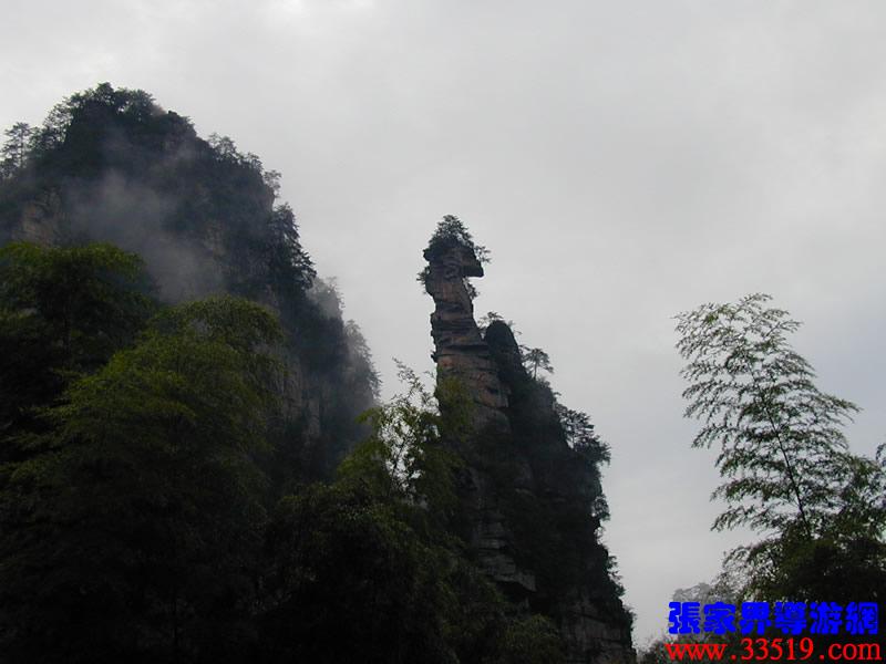 (南天一柱)現(xiàn)在我們前方幽谷峰林中有一高達(dá)200多米的孤峰,宛如擎天玉柱。上部灌木點(diǎn)綴,中部巖身赤裸,下部樹木遮掩,峰體渾圓、偉岸,因立南天門下而得名?!?/p>