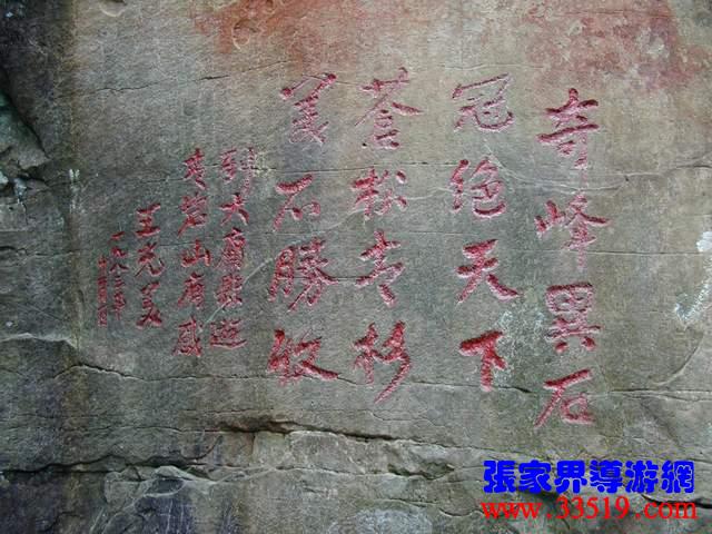 (王光美詩(shī)刻)1983年11月30日,前國(guó)家主席劉少奇夫人王光美在省人大副主任羅秋月等人陪同下,登上了張家界,她是最早訪問張家界的上層名流。想當(dāng)年,這里還是一條人工剛剛挖出來的小毛路,王光美被一路風(fēng)光所震撼,也不免勾起了許多關(guān)于劉少奇的往事。這四句詩(shī)并不是一氣呵成的,前后到了四處景點(diǎn),才吟出這四句詩(shī)來:奇峰異石,冠絕天下,蒼松青杉,美不勝收。