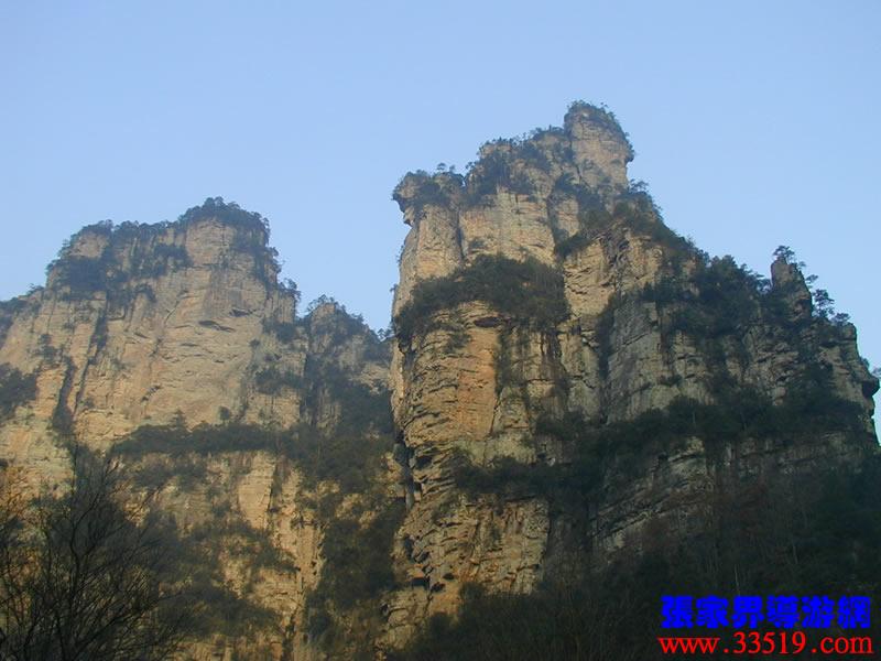 (金鞭巖、神鷹護(hù)鞭)如果要問張家界國家森林公園的標(biāo)志景點(diǎn),答案是現(xiàn)成的:金鞭巖。早在清代中期,一些文人就把張家界的峰林及百丈峽列入“永定八景”。其一叫“危峽啼猿”;其二叫“層巖涌塔”:“縣西二十里青崖山,其前五山并立,層峙如浮圖。中一峰更峻拔,上插宵漢,晴輝雪積,最擅奇觀。”這里說的“其中一峰”,指的金鞭巖。八大景點(diǎn)張家界占其二,可見先人是有眼力的。金鞭巖相對高度380多米,拔地而起,直插云霄,無論你遠(yuǎn)看近看,正看側(cè)看,都是一根刺破青天的長鞭!在金鞭巖左側(cè)的那座巖峰,大家看多像一只兇猛的老鷹,勾嘴瞪眼,雙翅略展,時刻警覺地守護(hù)著金鞭,人稱“神鷹護(hù)鞭”。