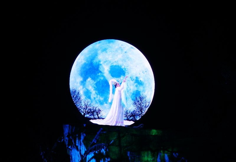 本項目舞臺及舞美設(shè)施為目前世界范圍內(nèi)的實(shí)景演出中投資最多、舞臺機(jī)械裝置最為復(fù)雜且規(guī)模最大、燈光設(shè)施數(shù)量最多且分布范圍最大的,另外主舞臺也是世界最大的全景玻璃鋼舞臺(10000平方米)。舞臺機(jī)械設(shè)施中,尤其是跨度60米、高度32米的伸縮飛橋,是目前世界范圍的演出項目中絕無僅有的大型舞臺機(jī)械裝置。燈光數(shù)量:大型燈光1100盞,中小型燈光2800盞;演出音響為專門定制的美國EAW音戶外防雨、防潮音響設(shè)備,也是目前國內(nèi)演出項目中投資最大的。