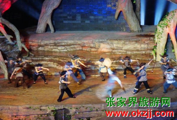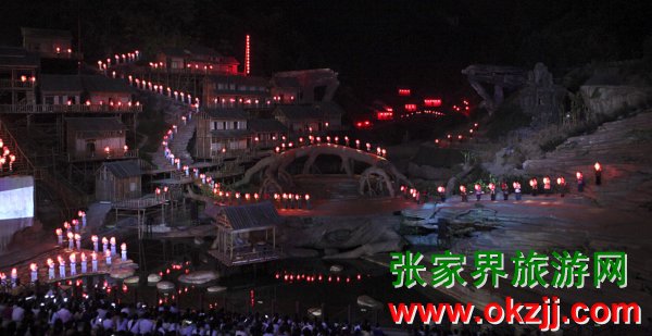 是目前世界第一臺有完整故事情節(jié)的山水實(shí)景音樂歌舞劇。舞臺選址在天門山風(fēng)景區(qū)山門口內(nèi)至天門山頂?shù)恼麠l峽谷,總投資達(dá)到1.2億元,演員隊伍達(dá)530多人。主舞臺以10000平米的玻璃鋼打造,是目前世界最大的全景玻璃鋼舞臺。