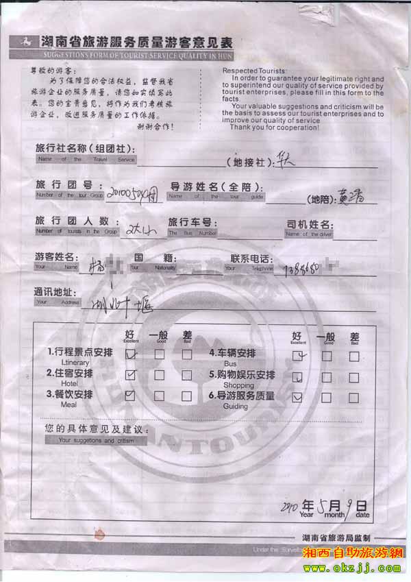 2010年5月9日楊先生旅游質(zhì)量反饋