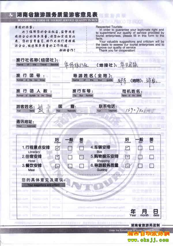 2010年5月11日岳陽樊小姐旅游質(zhì)量反饋