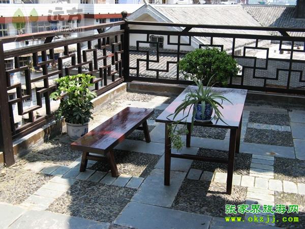 活動區(qū)域有兩個,一個是走廊活動區(qū),適合吹風(fēng)、發(fā)呆,一個是屋頂陽臺活動區(qū),適合日光浴,陽臺上的盆景和花卉會映襯著天門山景!