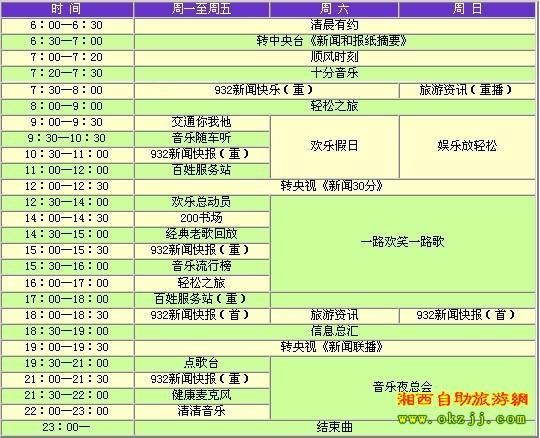 張家界旅游交通頻道茲定于四月八號(hào)試播,頻率為FM93.2兆赫和103.2兆赫。頻道以立足旅游交通、服務(wù)百姓大眾為宗旨,設(shè)置了《清晨有約》、《順風(fēng)時(shí)刻》、《932新聞快報(bào)》、《輕松之旅》、《交通你我他》、《百姓服務(wù)站》、《歡樂(lè)總動(dòng)員》和《音樂(lè)隨車(chē)聽(tīng)》等欄目。屆時(shí),聽(tīng)眾可以通過(guò)熱線(xiàn)電話(huà)、短信平臺(tái)以及網(wǎng)絡(luò)廣播等多種途徑參與到電臺(tái)節(jié)目中來(lái),在第一時(shí)間了解新聞動(dòng)態(tài),掌握市場(chǎng)信息,享受娛樂(lè)休閑。